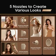 Includes a diffuser, styling nozzle, smoothing nozzle, anti-frizz nozzle, and essence nozzle. Each attachment magnetically snaps on to create customised styles, from defined curls to sleek, polished finishes.
