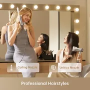 Included are two specialised nozzles: the unfrizz nozzle for sleek, straight styles and the curling nozzle for creating natural curls. These attachments, combined with the dryer's versatile settings, provide a comprehensive styling experience.