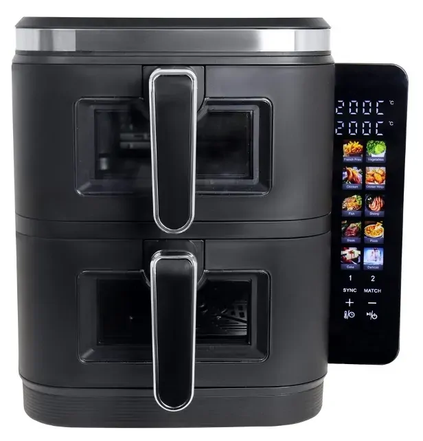 SPACE SAVER, DUAL ZONE 11 LITRE DUAL AIR FRYER, 2 DIFFERENT TEMPERATURES, 2 DIFFERENT TIMES, 2 BASKET 5.5 LITRES- LITRES 8 PRESETS, BLACK/STAINLESS STEEL, FOLDABLE DISPLAY AND CONTROL IN COLOUR ICONS