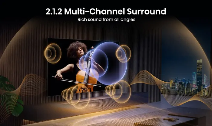 The 2.1.2 multi-channel surround system fills the room with immersive sound that moves around and above you, bringing movies, sport and games to life.