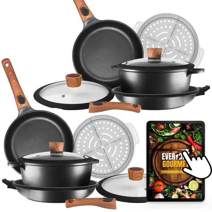 The Diamond Earth StackSmart 6pc Cookware Set is designed to solve all your kitchen frustrations. With safe and secure detachable handles, a stackable space-saving design, and a safe German-engineered non-stick surface, it offers durability, convenience, and superior cooking performance. Whether you're a busy home cook, have a small kitchen, or love versatile cookware, StackSmart delivers Fast easy cooking, better flavours, and perfect results—every time.