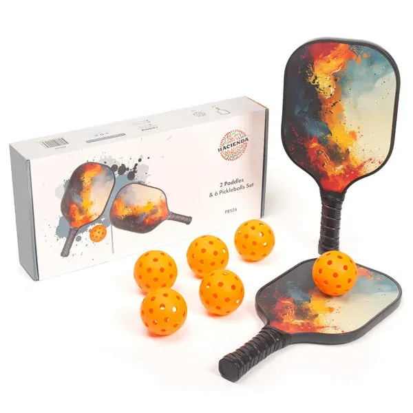 PICKLEBALL 6PACK WITH 2 PREMIUM DURABLE FIBREGLASS PADDLES AND 6 HIGH PERFORMANCE AERODYNAMIC BALLS