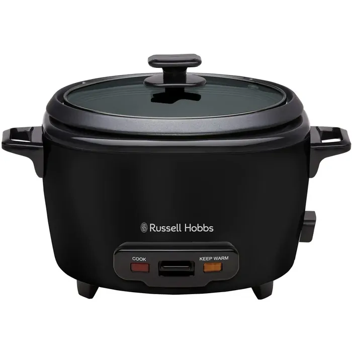 Turbo Rice Cooker - Black Cooks 20 cups of cooked rice Large 3L removable non-stick bowl Cook & auto keep warm settings Cooking indicator lights Faster cooking technology Tempered glass lid & built in lid holder Cool touch handles & knob Dishwasher safe parts for quick clean up Includes: Steamer basket, Measuring cup, Spoon
