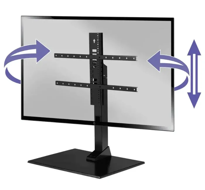 Suits TV Sizes 40-86" 600 x 400 The SANUS Swivel TV Stand is a table-top stand for TVs 40"-86" and the perfect replacement for TV feet that are traditionally included with TVs. By providing 70 degrees of swivel left to right, Integrated cable management to conceal and route cables. Featuring 8" of height adjust, great for soundbars and other devices beneath your TV.