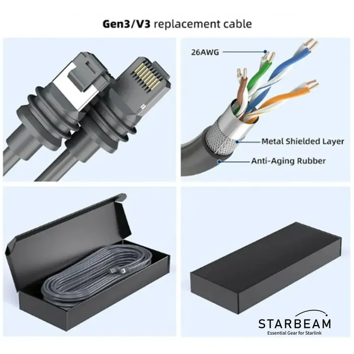 • Cable Type: Specialised Starlink GEN3 Standard connectivity cable - 26AWG cable with metal sheilding, anti-aging UV protected rubber coating
