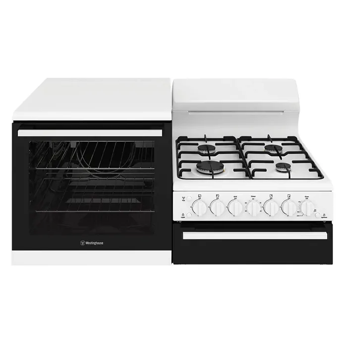 White elevated gas freestanding cooker with separate gas grill, conventional gas oven, 60 minute timer and 4 burner gas cooktop with manual ignition.