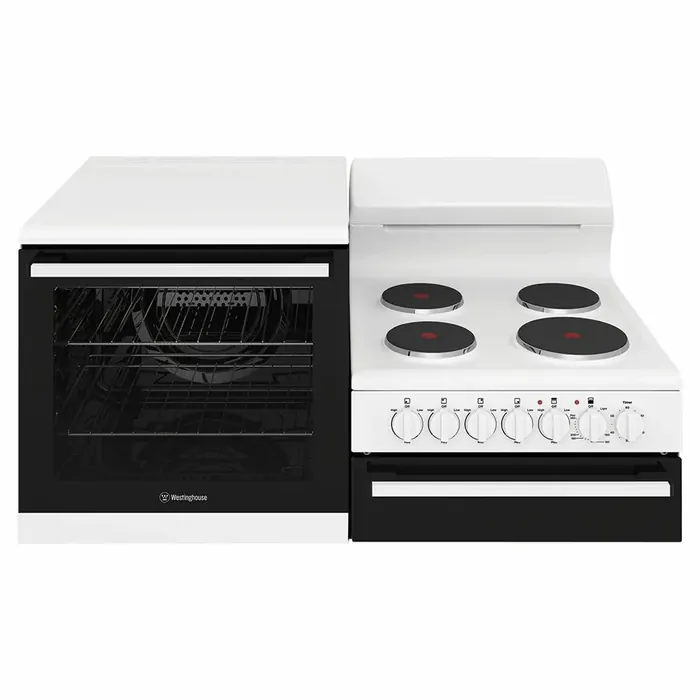 White elevated electric freestanding cooker with separate electric grill, fan forced electric oven, 60 minute timer and 4 zone solid cooktop.
