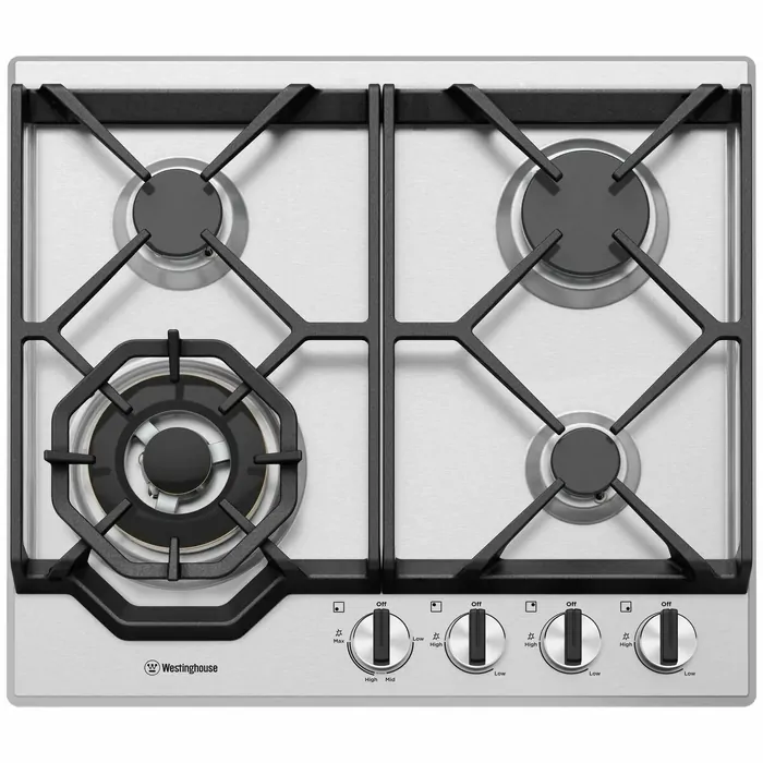 60Cm Gas Cooktop, 4 Burner, 17 Mj/H Wok Burner, Dual Valve Control, Cast Trivets, Stainless Steel