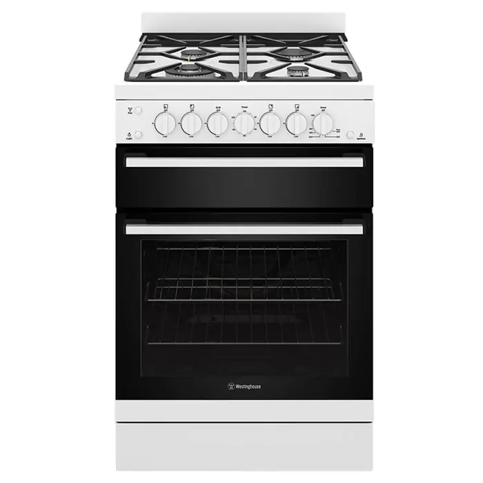 60cm white gas freestanding cooker with separate gas grill, gas oven with fan, 120 minute timer with ringer, 4 burner gas cooktop with 14.2 mj/hr wok burner and cast iron trivets. LP conversion kit included.