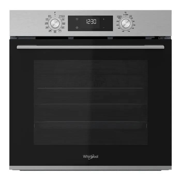 The W4OMK581RU1XA Whirlpool 60cm Multi-Function Hybrid Clean Oven in stainless steel features a 71L capacity, LED digital display, and push knob controls. Its Hybrid Flexi Clean system ensures effortless cleaning, while five cooking methods—Conventional, Forced Air, Grill, Turbo Grill, and Bottom Heating—and four specialised functions—Air Fry, Bread, Maxi Cooking, Pizza, and Defrosting—make it versatile for any meal.